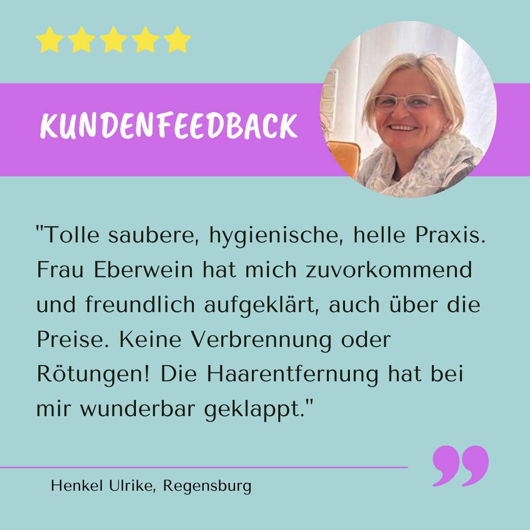 Bin seit ca. 1/2 Jahr Kundin bei Frau Eberwein. Ich bin jedes Mal wieder erstaunt über die Flexibilität bei Terminvereinbarungen und die gute und freundliche Beratung in der Praxis. Ich würde den Schritt zur dauerhaften Haarentfernung jedes Mal wieder wagen und bin super zufrieden.